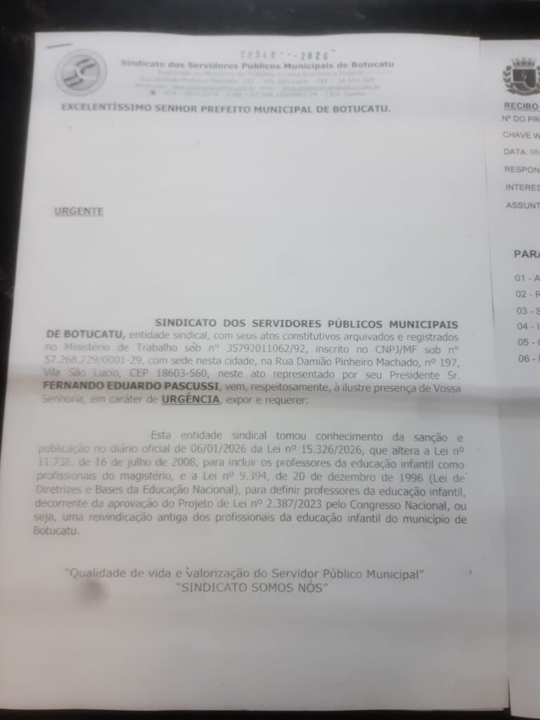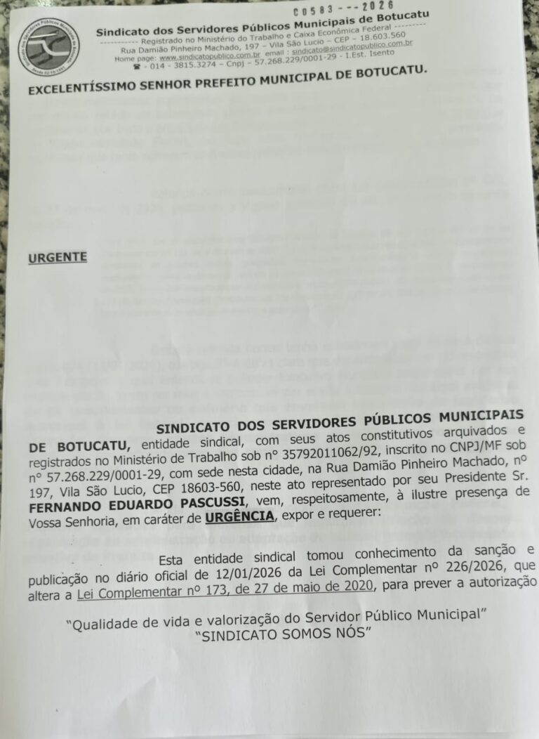 O Sindicato dos Servidores Públicos Municipais de Botucatu (SISPUMB) protocolou, em caráter de urgência, requerimento junto ao Poder Executivo Municipal